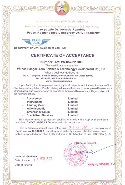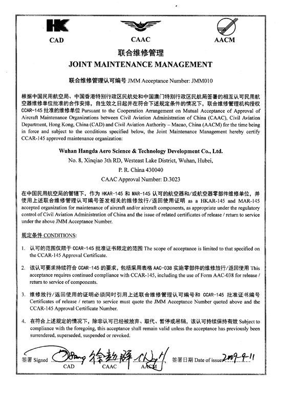 2001年10月 公司獲中國民航總局授權(quán)的民航維修許可證。